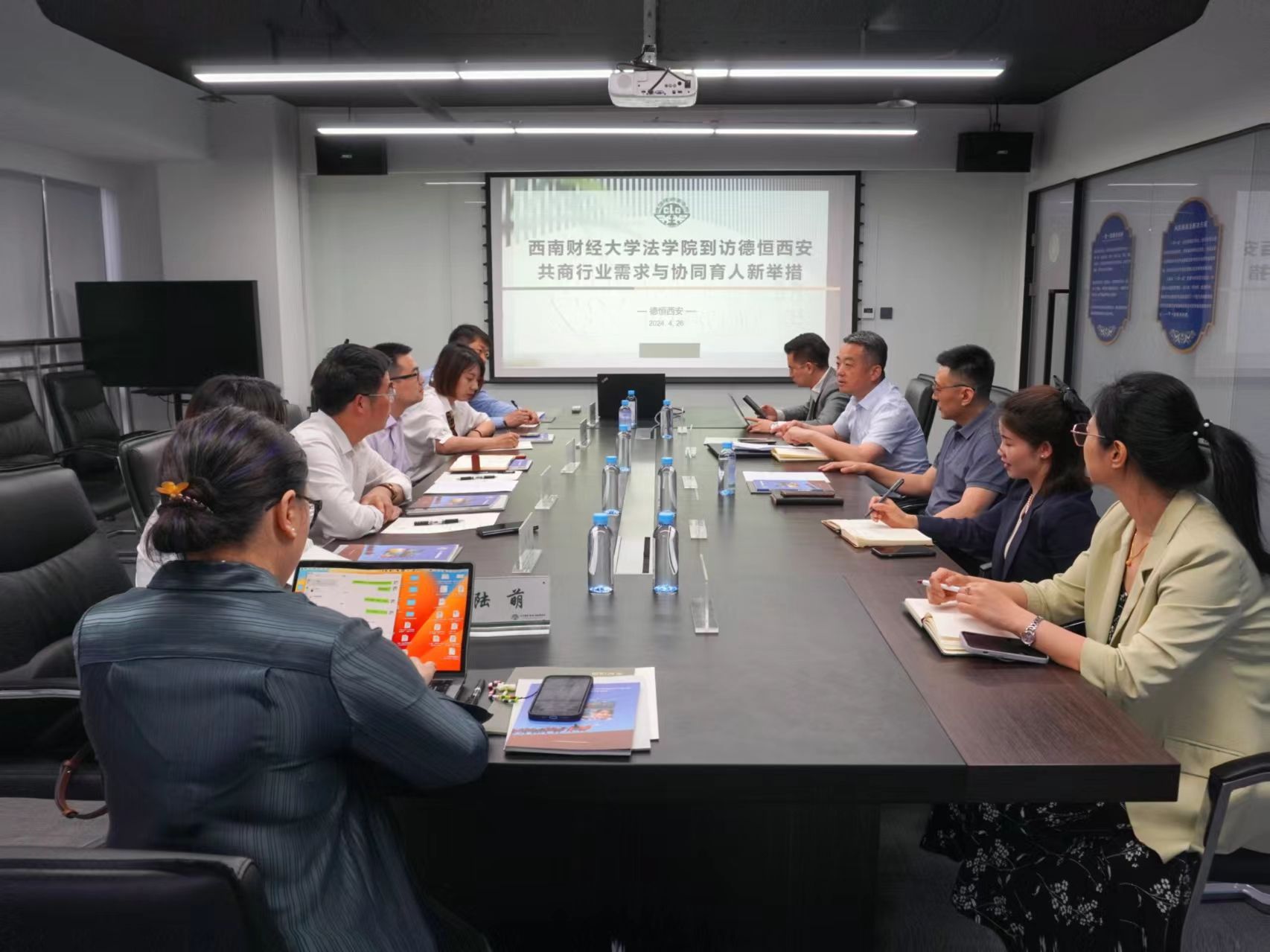 江波院长助理一行首先拜访了北京德恒(西安)律师事务所,受到德恒所陈浩副主任、管理合伙人李少伦、高级合伙人李育松、合伙人万焦及行政主管李静的热情接待。双方深入交流了律所的人才构成和需求、法律人才培养特色和现状、青年律师的成长和必备素质等话题,以进一步深化双方合作,构建法律人才实践教育双赢模式。